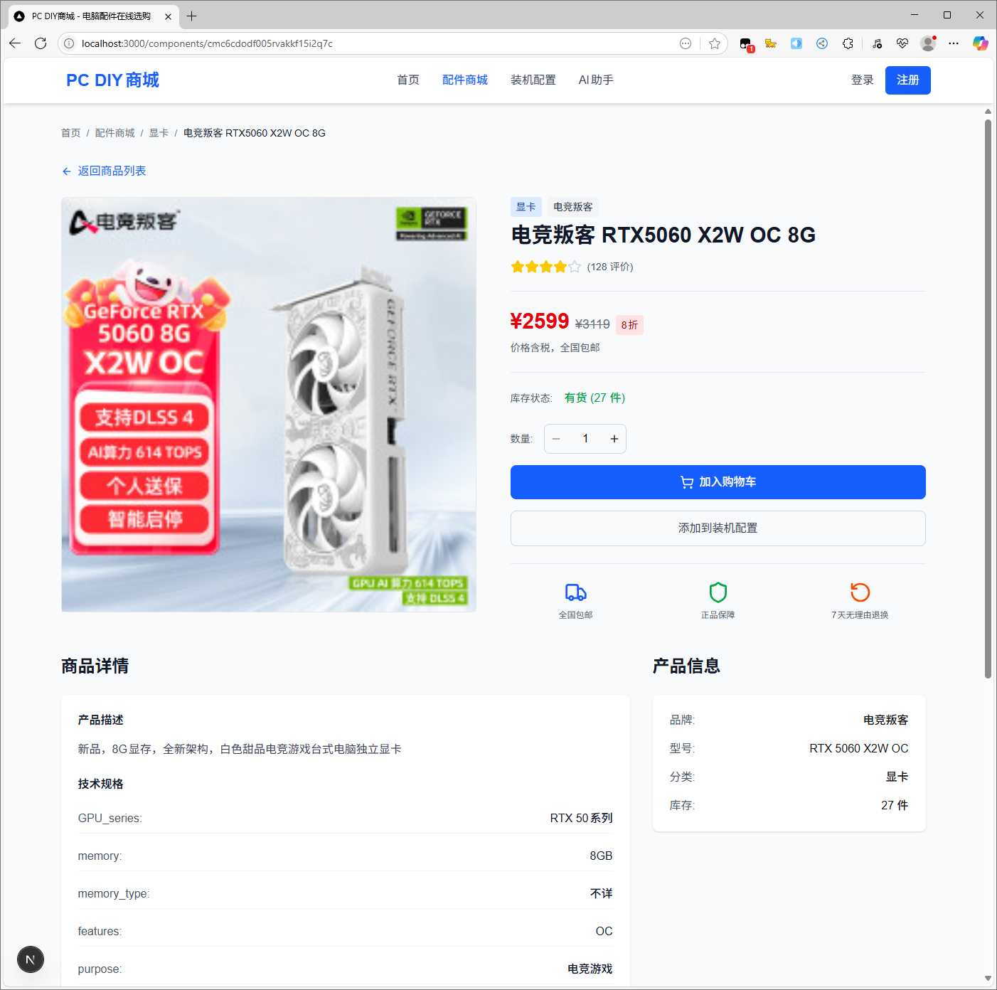 在线电脑DIY系统是一个面向电脑爱好者和DIY玩家的综合性电商平台。系统不仅提供传统的商品浏览、购买功能,更创新性地集成了AI智能助手,为用户提供专业的配件选择建议和装机指导。系统采用B2C模式,支持多角色用户管理,具备完整的商品管理、订单处理、数据统计等功能模块。