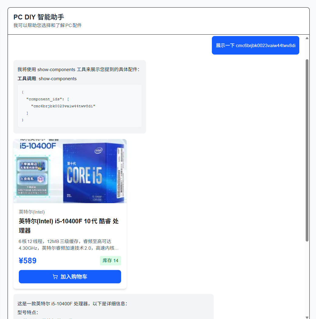 show_card 指令展示show_card::这是一个明确的UI渲染指令。当AI调用show-components工具后,后端获取到配件的详细信息,并将其序列化为JSON字符串,附在show_card:之后yield出去。前端接收到这个格式的字符串后,就知道应该解析其后的JSON数据,并渲染成配件卡片UI,而不是当成普通文本显示。 -