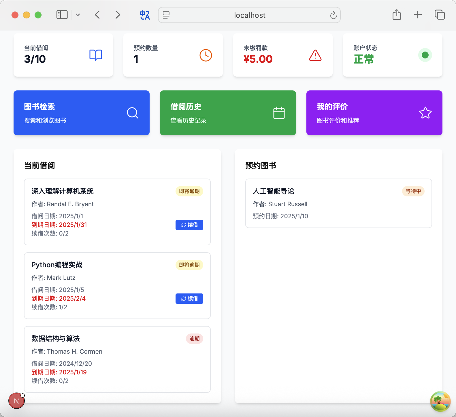• 用户功能(学生): 学生用户应能通过多种条件如书名、作者、分类、ISBN组合查询图书馆藏方便地查看图书的详细信息包括简介、封面及当前可借状态在热门图书无现本时进行在线预约随时查看个人的借阅历史、当前正在借阅的图书及预约状态在满足条件时在线续借图书查询和缴纳产生的罚款对已借阅完成的图书进行评分和撰写评论以及接收系统基于借阅历史或其他规则推荐的图书。