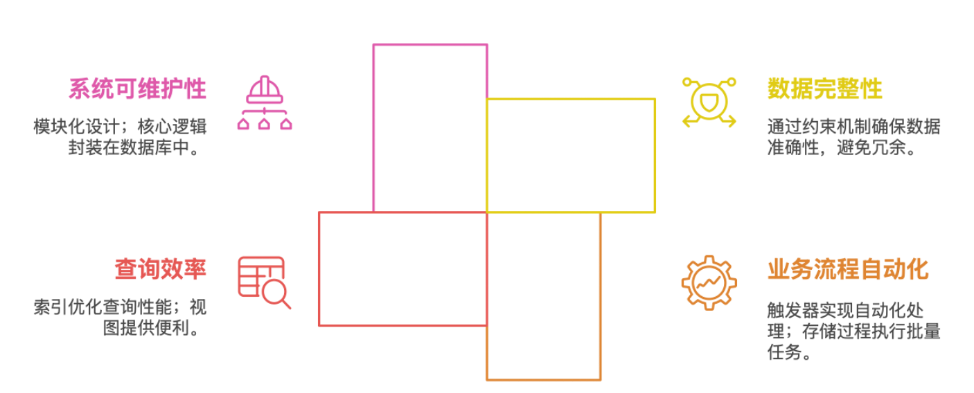 - 数据完整性与一致性: 通过合理的数据库模式设计、主外键约束、唯一约束、检查约束及触发器机制,确保系统数据的准确性、一致性和完整性,避免数据冗余和异常。